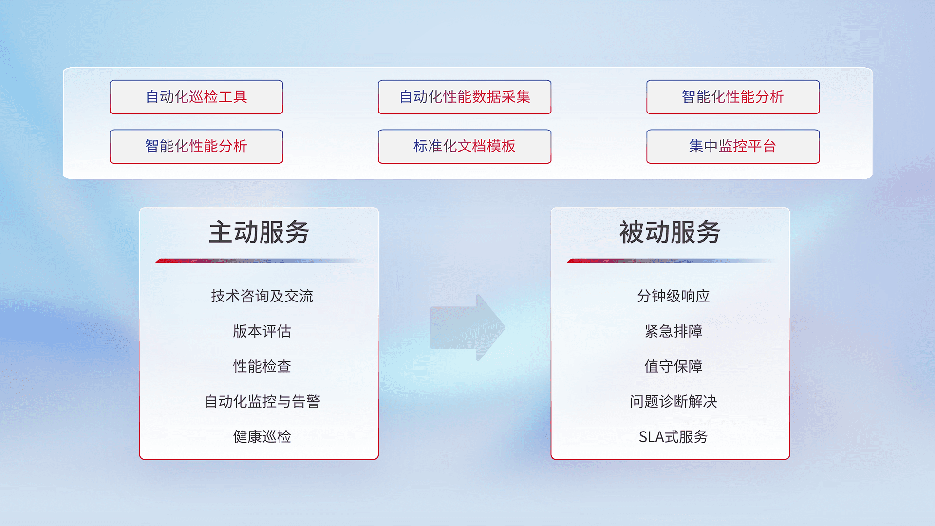 智能化工具和标准化文档,,保障服务质量,,提供主动服务(包含技术咨询、、、版本评估、、、性能检查、、、自动化监控与告警、、、健康巡检)和被动服务包含(分钟级响应、、、紧急排障、、、值守保障、、问题诊断解决、、、SLA服务)。。